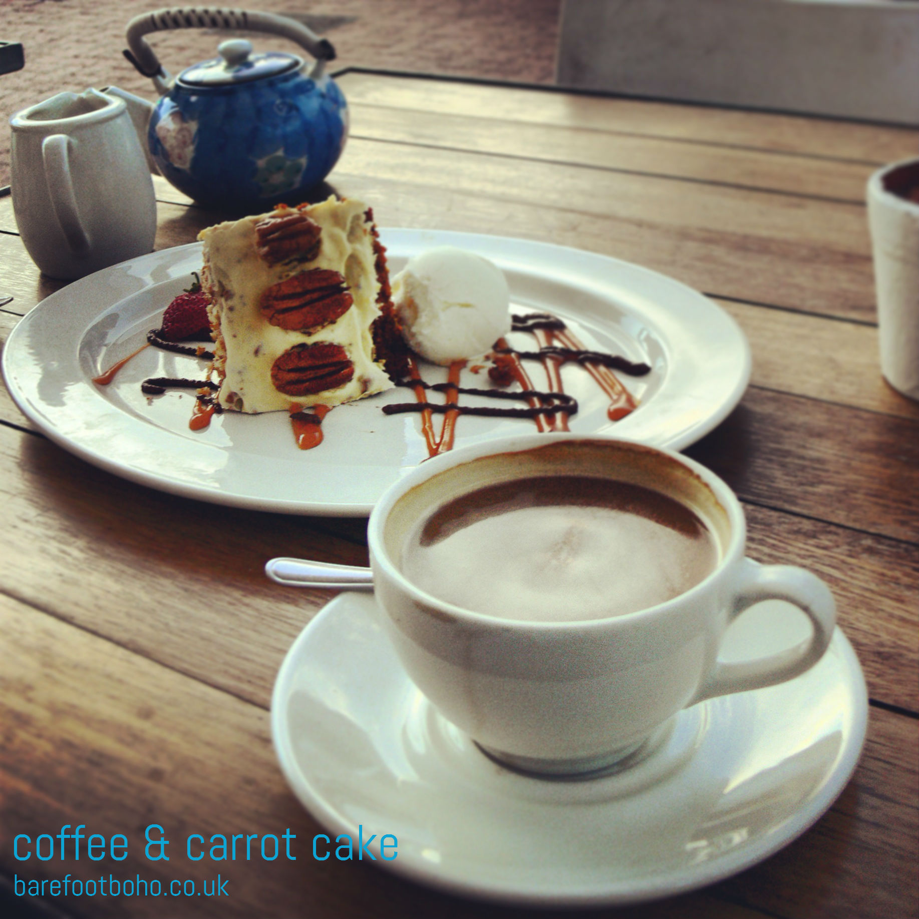 Sticky, moist, velvety, caramelly, chocolatey carrot cake with a cup of rich dark coffee.