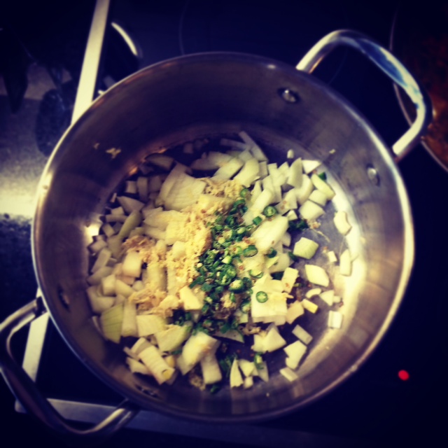 1. put olive oil, onions, ginger, garlic and chillies into a pan and cook for about 5 minutes, until softened.