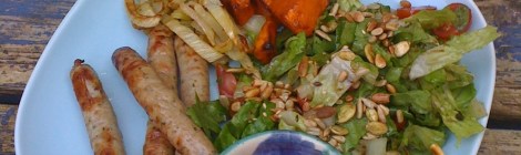 Chipolatas Salad Roasted butternut squash Sauté fennel Nando’s garlic piri piri sauce
